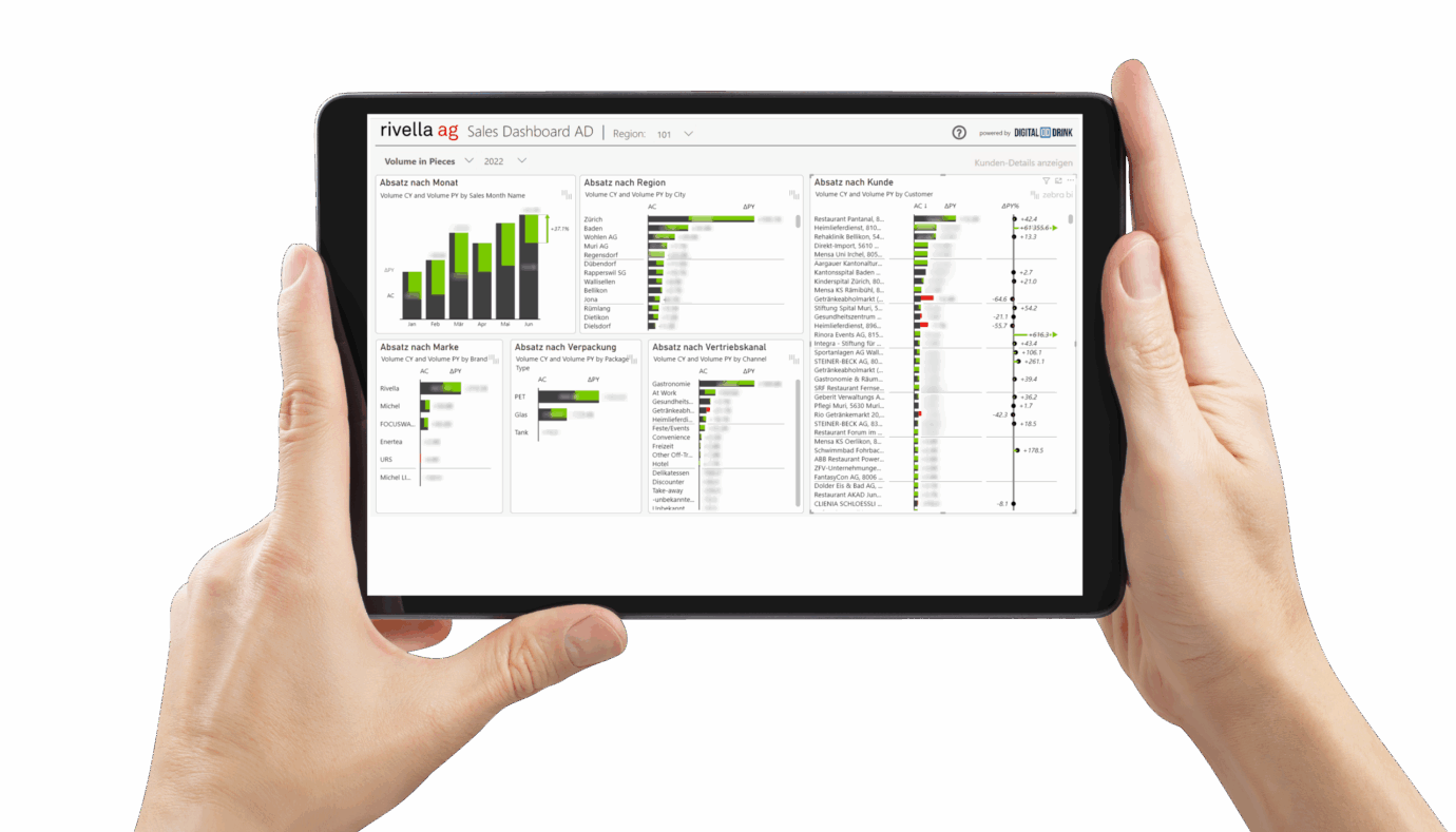 Die Absätze werden dabei mit Ihren bei DIGITALDRINK publizierten Produkten verknüpft. Dadurch stehen nebst dem Artikel eine Vielzahl weiterer Attribute, wie z.B. Kategorie, Verpackung, Material, Inhaltsgrösse, etc. für Auswertungen zur Verfügung.